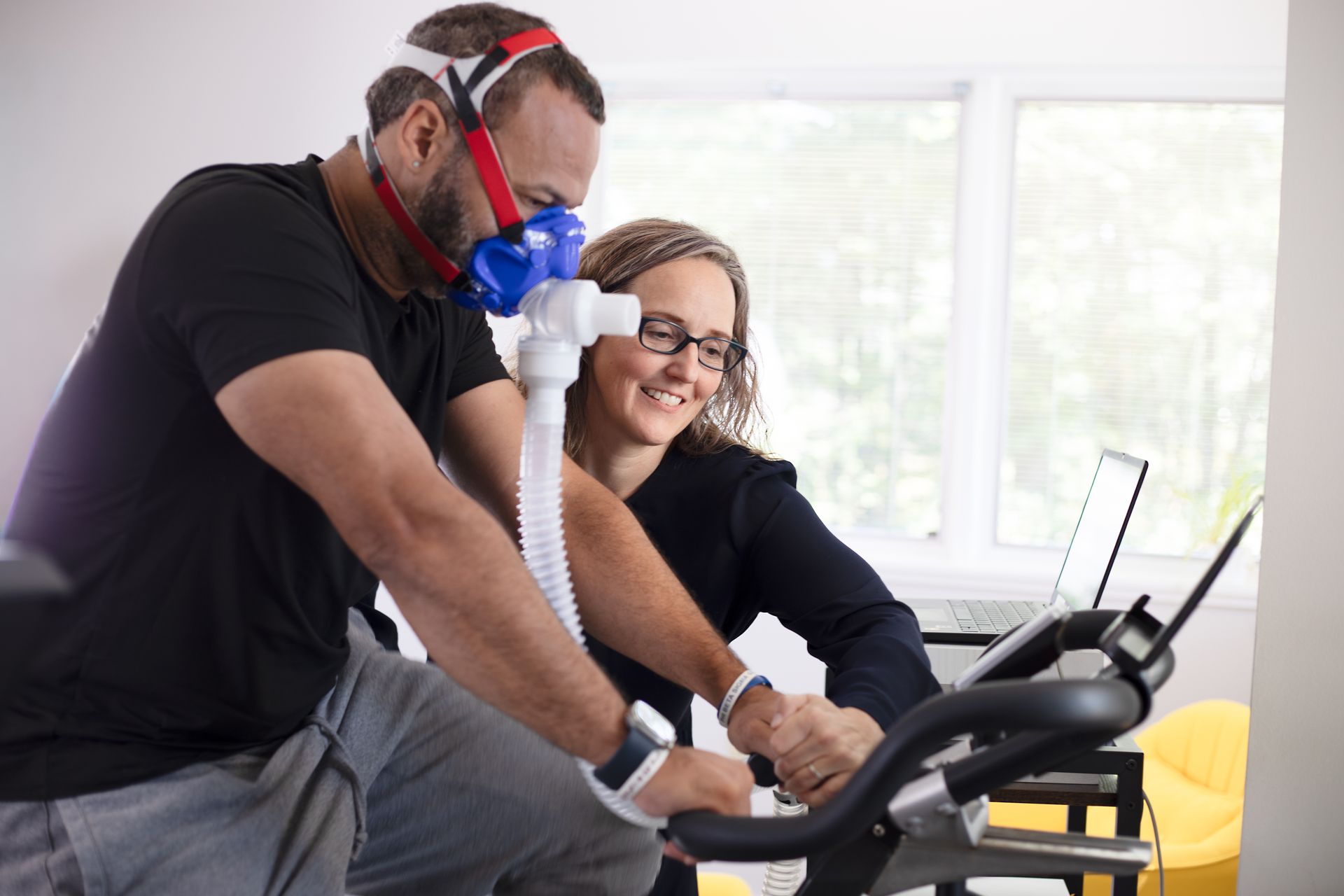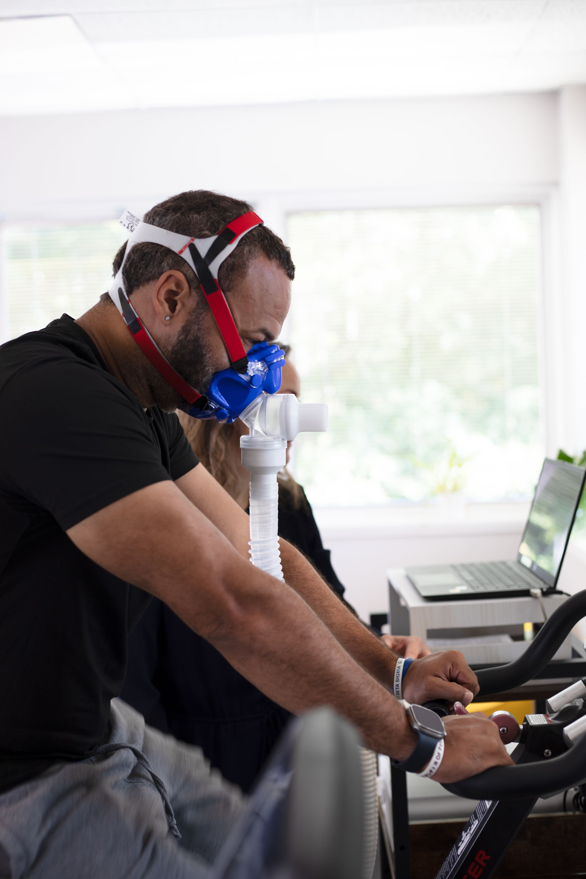 You’ll wear a mask over your face to record your oxygen consumption and carbon dioxide production while running on a treadmill or riding a bike.